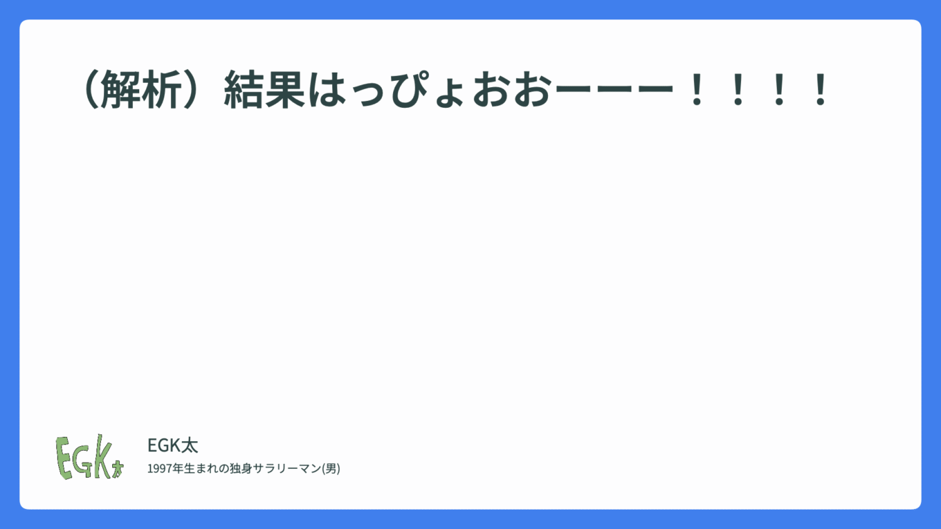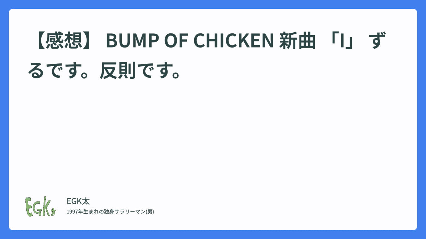自己紹介 2023.08.27 はじめまして egkta うわずみブログ 投資歴3年半での含み益は〇〇万円、でも... 2025.10.19 お金・FIRE egkta うわずみブログ 【続・感想】 BUMP OF CHICKEN 「I」 めっちゃ近くにいる... 2025.10.15 BUMP OF CHICKEN egkta うわずみブログ (解析)結果はっぴょおおーーー!!!! 2025.10.13 雑談 egkta うわずみブログ 【感想】 BUMP OF CHICKEN 新曲 「I」 ずるです。反則です。 2025.10.11 BUMP OF CHICKEN egkta うわずみブログ 人の楽しさを否定しないぞ 2025.10.10 雑談 egkta うわずみブログ 世界最強のチャーハンを作ろう その1 2025.10.08 世界最強のチャーハンを作ろう egkta うわずみブログ メモ:サブスク整理 2025.10.06 Uncategorized egkta うわずみブログ 小田和正は『風属性』なのか? 2025.10.05 音楽 egkta うわずみブログ ギター奮闘記 その8 2025.10.04 ギター奮闘記 egkta うわずみブログ そこにそんな広告掲載していいの?!! 2025.10.03 雑談 egkta うわずみブログ もっと見る