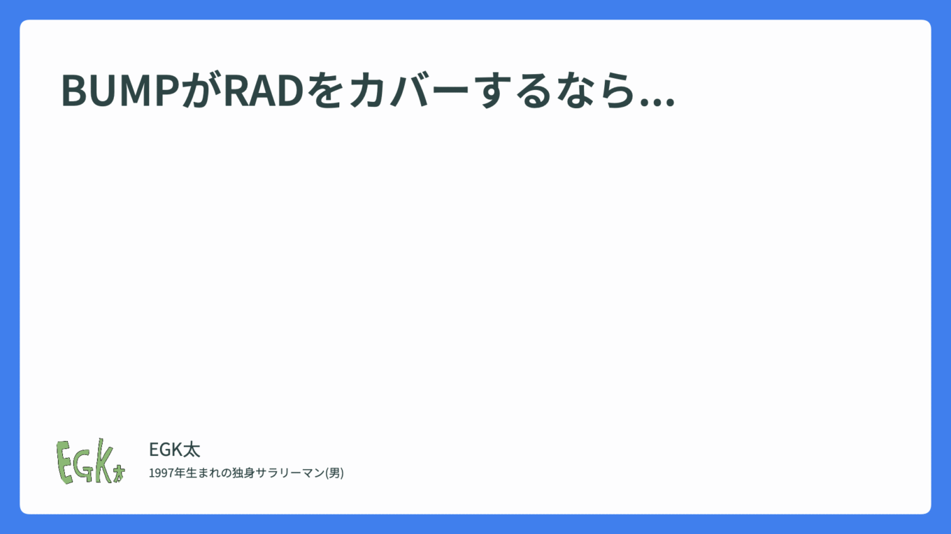 自己紹介 2023.08.27 はじめまして egkta うわずみブログ BUMPがRADをカバーするなら... 2025.10.21 BUMP OF CHICKEN egkta うわずみブログ 投資歴3年半での含み益は〇〇万円、でも... 2025.10.19 お金・FIRE egkta うわずみブログ 【続・感想】 BUMP OF CHICKEN 「I」 めっちゃ近くにいる... 2025.10.15 BUMP OF CHICKEN egkta うわずみブログ (解析)結果はっぴょおおーーー!!!! 2025.10.13 雑談 egkta うわずみブログ 【感想】 BUMP OF CHICKEN 新曲 「I」 ずるです。反則です。 2025.10.11 BUMP OF CHICKEN egkta うわずみブログ 人の楽しさを否定しないぞ 2025.10.10 雑談 egkta うわずみブログ 世界最強のチャーハンを作ろう その1 2025.10.08 世界最強のチャーハンを作ろう egkta うわずみブログ メモ:サブスク整理 2025.10.06 Uncategorized egkta うわずみブログ 小田和正は『風属性』なのか? 2025.10.05 音楽 egkta うわずみブログ ギター奮闘記 その8 2025.10.04 ギター奮闘記 egkta うわずみブログ もっと見る